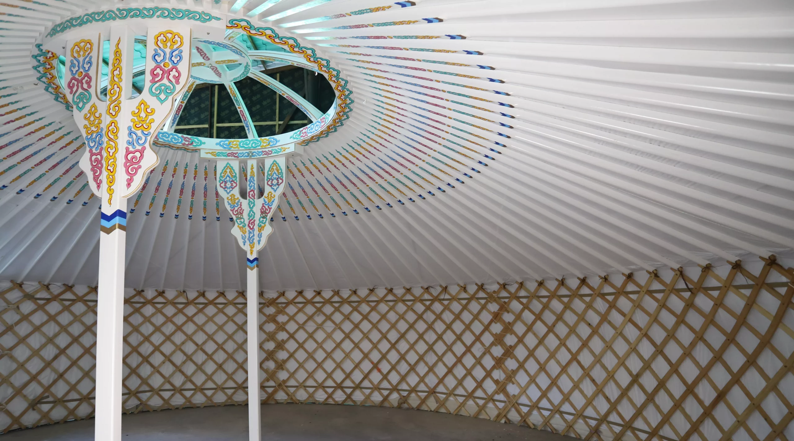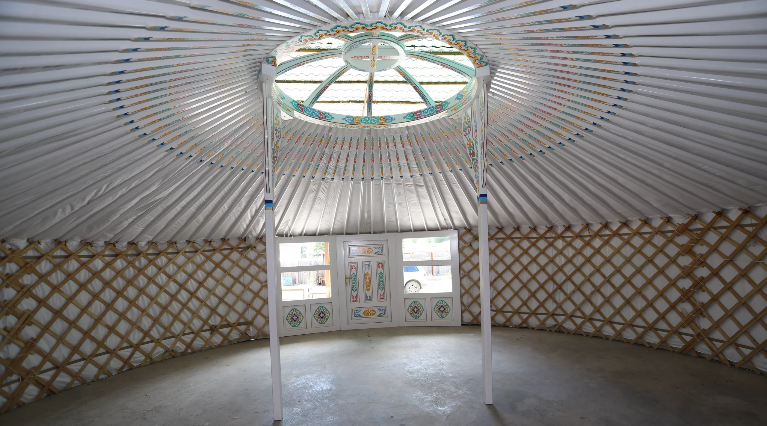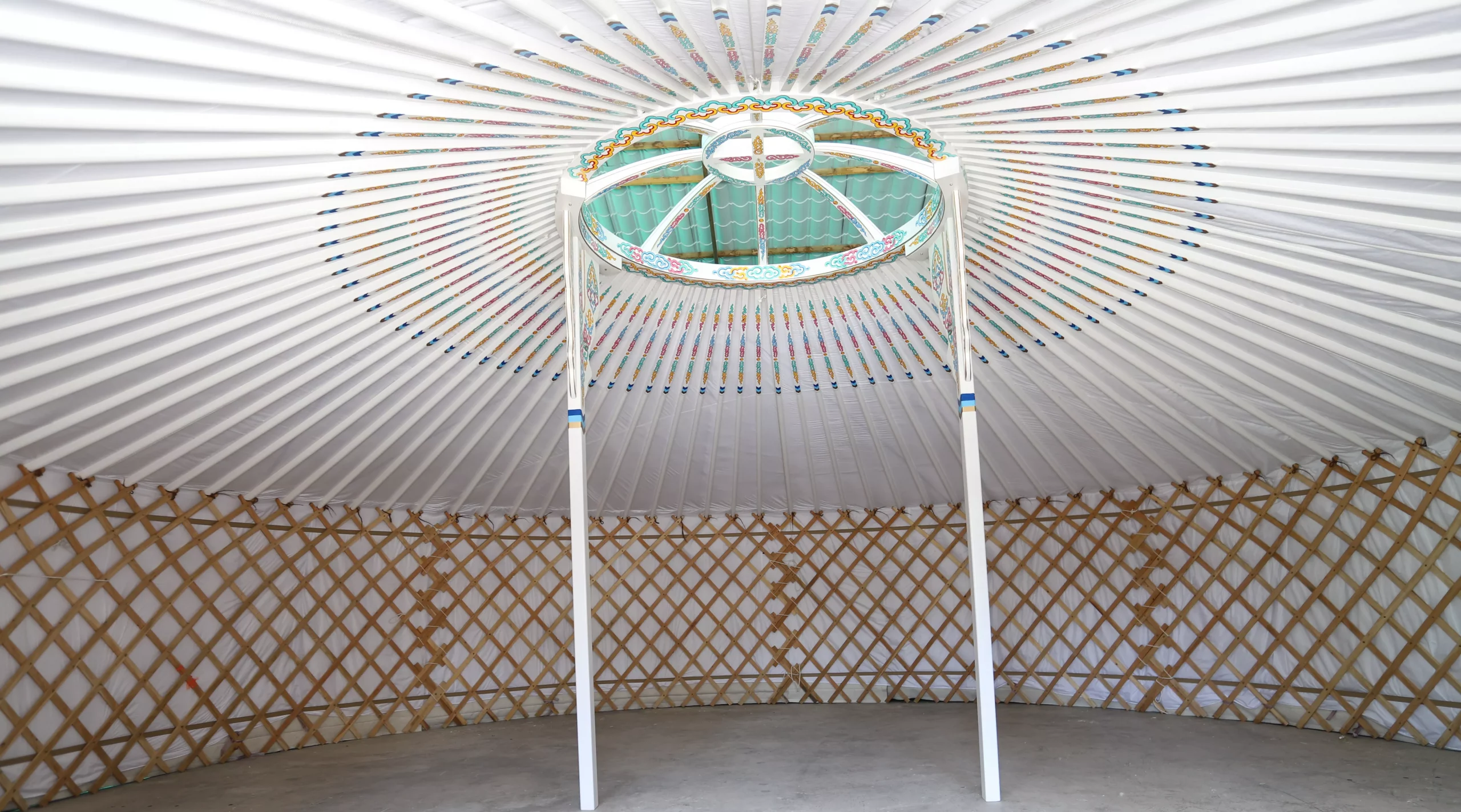 The customer who ordered this yurt wanted to have the inside painted in solid white and decorated with a traditional Mongolian motif, and the result is beautiful.