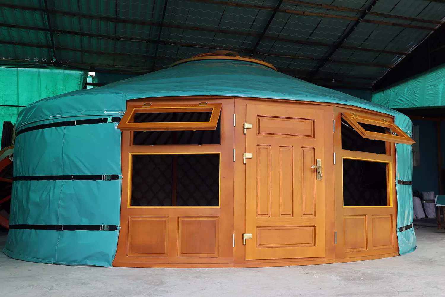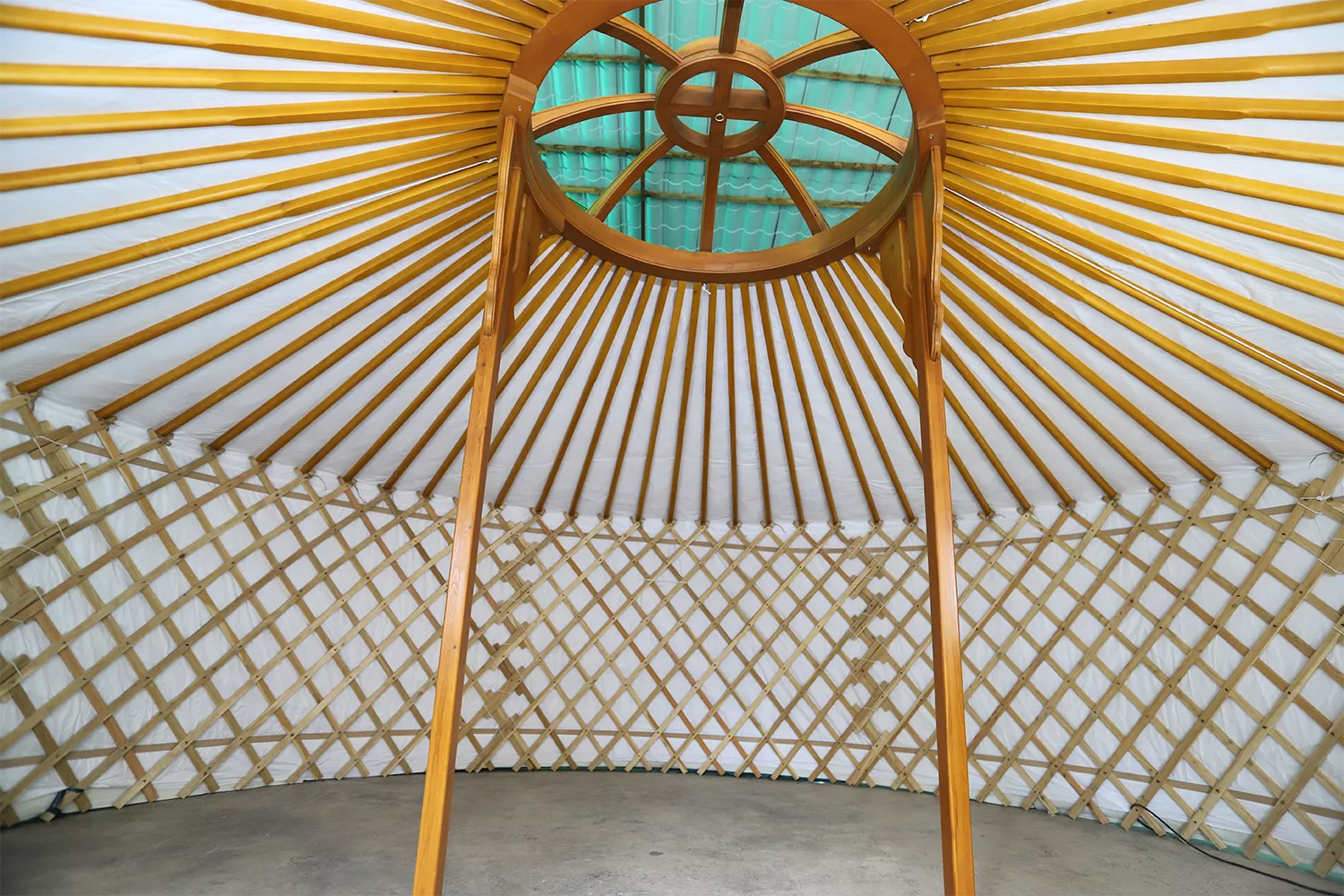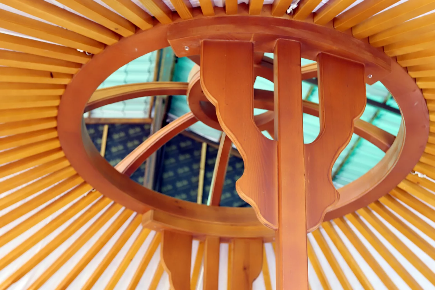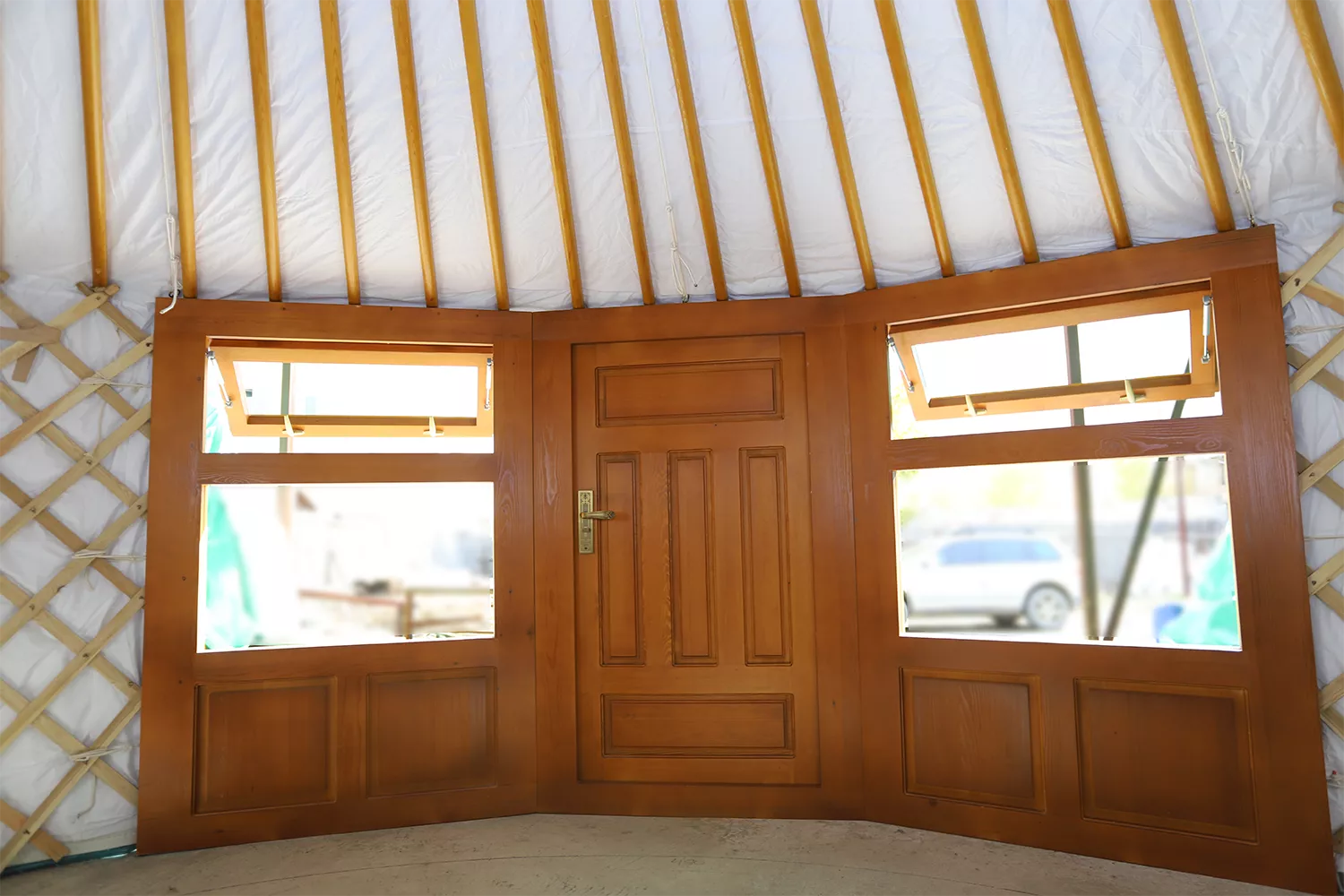 Images are of the actual yurt for sale. Transparent polycarbonate windows, transparent skylight finishes, and the chimney flashing in the skylight will be installed as standard if not already shown in the pictures.