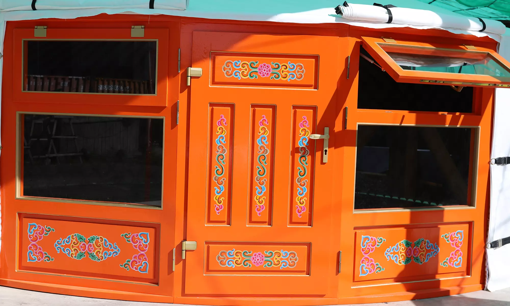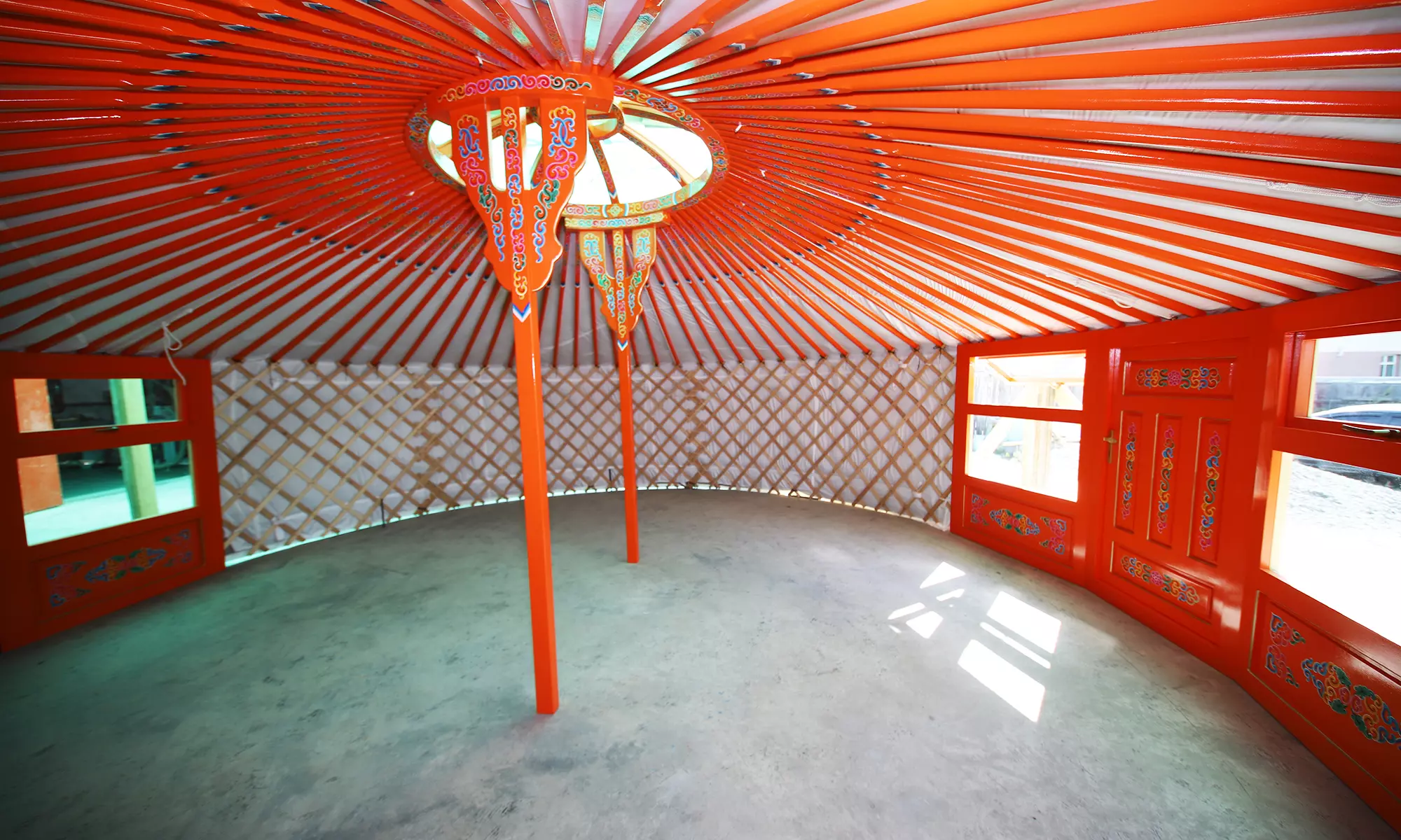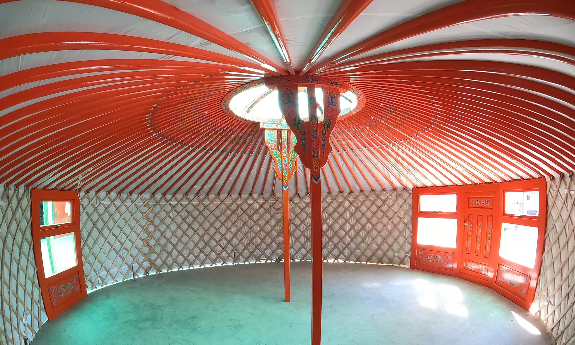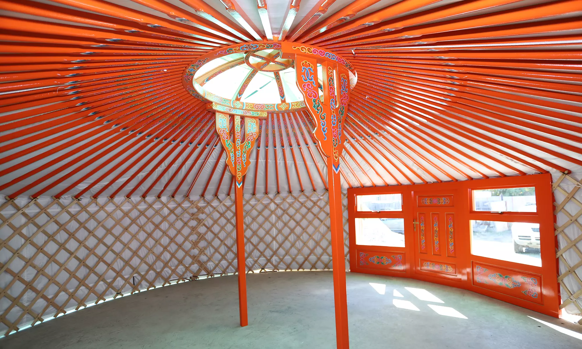Images are of the actual yurt for sale. Transparent polycarbonate windows, transparent skylight finishes, and the chimney flashing in the skylight will be installed as standard if not already shown in the pictures.